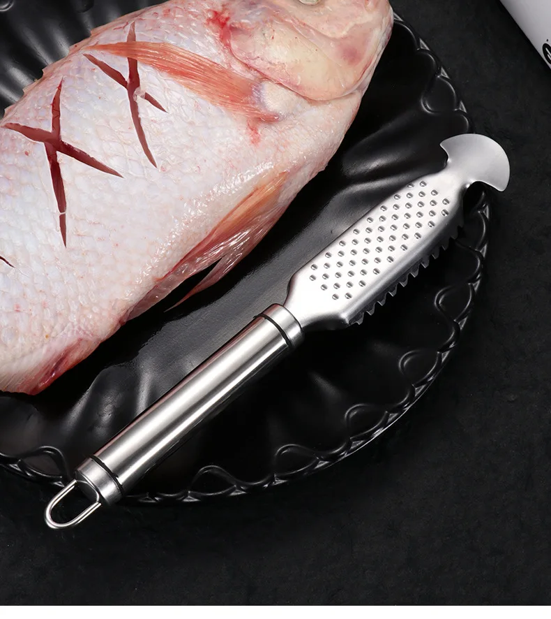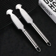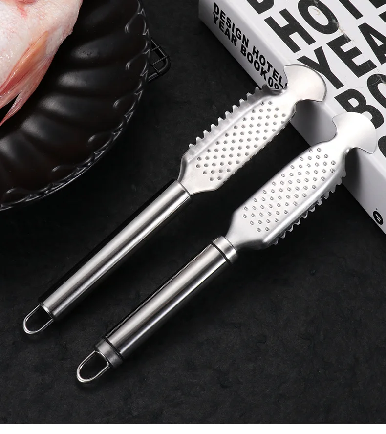 This versatile stainless steel kitchen tool is designed to streamline your food preparation tasks. Combining a fish scale scraper, belly knife, and fine grater in one durable implement, it's an essential tool for seafood lovers and cooking enthusiasts alike.